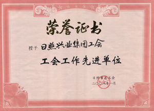 ·2008年,授予“日照興業(yè)集團有限公司工會房地產(chǎn)開發(fā)有限公司工會模范職工小家”