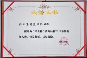 ·2011年2月,興業(yè)集團(tuán)藍(lán)球隊(duì)被評(píng)為“興業(yè)杯”黃海晨刊2010年度新聞人物,特發(fā)此證,以資鼓勵(lì)