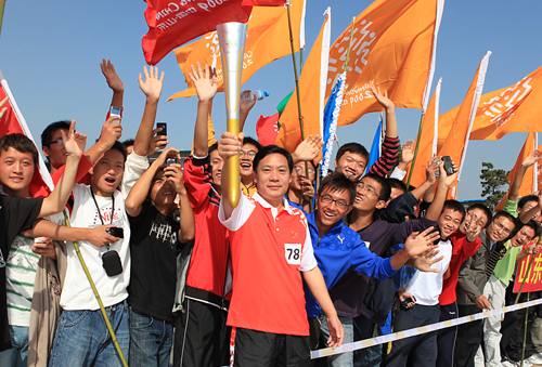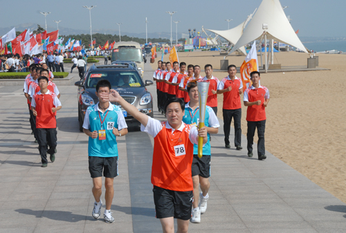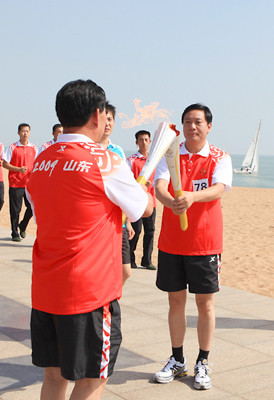 丁杰董事長作為全運會火炬日照傳遞活動的第七十八棒火炬手,參加了萬平口海濱生態(tài)廣場段的后三棒火炬?zhèn)鬟f。在等候火炬?zhèn)鬟f的空隙,他接受了日照電視臺記者的采訪。他說,第十一屆全運會火炬?zhèn)鬟f活動在我市舉行,將進一步促進“和諧中國,全民全運”理念的傳播與普及,進一步激發(fā)全市人民關心、 支持、參與和奉獻全運會的熱情。他表示,作為一名民營企業(yè)家代表能成為全運會的一名火炬手,他感到十分光榮和自豪,表示要把全運會的精神帶到企業(yè)中去,推動企業(yè)更好更快發(fā)展,為日照經(jīng)濟和社會各項事業(yè)的發(fā)展貢獻力量。采訪結束后,圍觀的群眾紛紛要求同丁杰董事長合影留念,他都欣然接受。10時左右,在現(xiàn)場觀眾的熱烈掌聲和歡呼聲中,丁杰董事長從上一棒火炬引燃了自己手中的“如意”火炬,高高舉在頭頂向圍觀人群示意,開始了神圣的火炬?zhèn)鬟f……